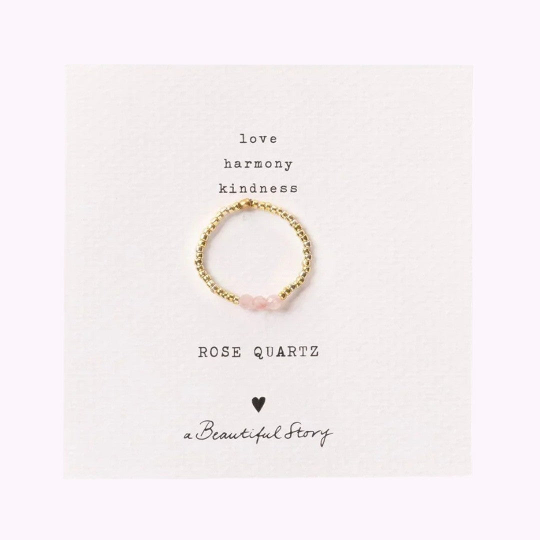 Material: 3 Rosenquarz-Edelsteine und goldfarbige Glasperlen, welche sich in der Farbe nicht verändern.