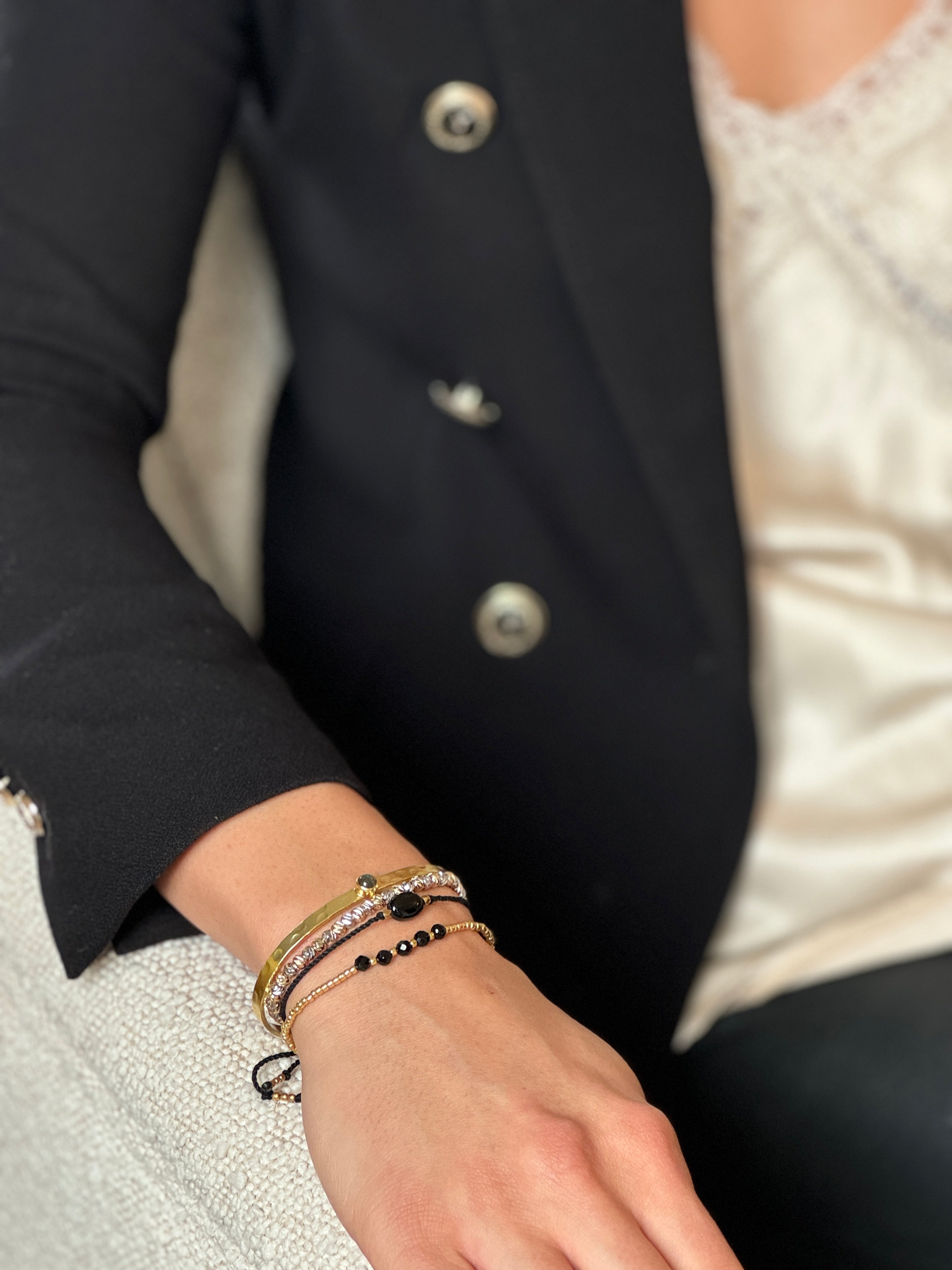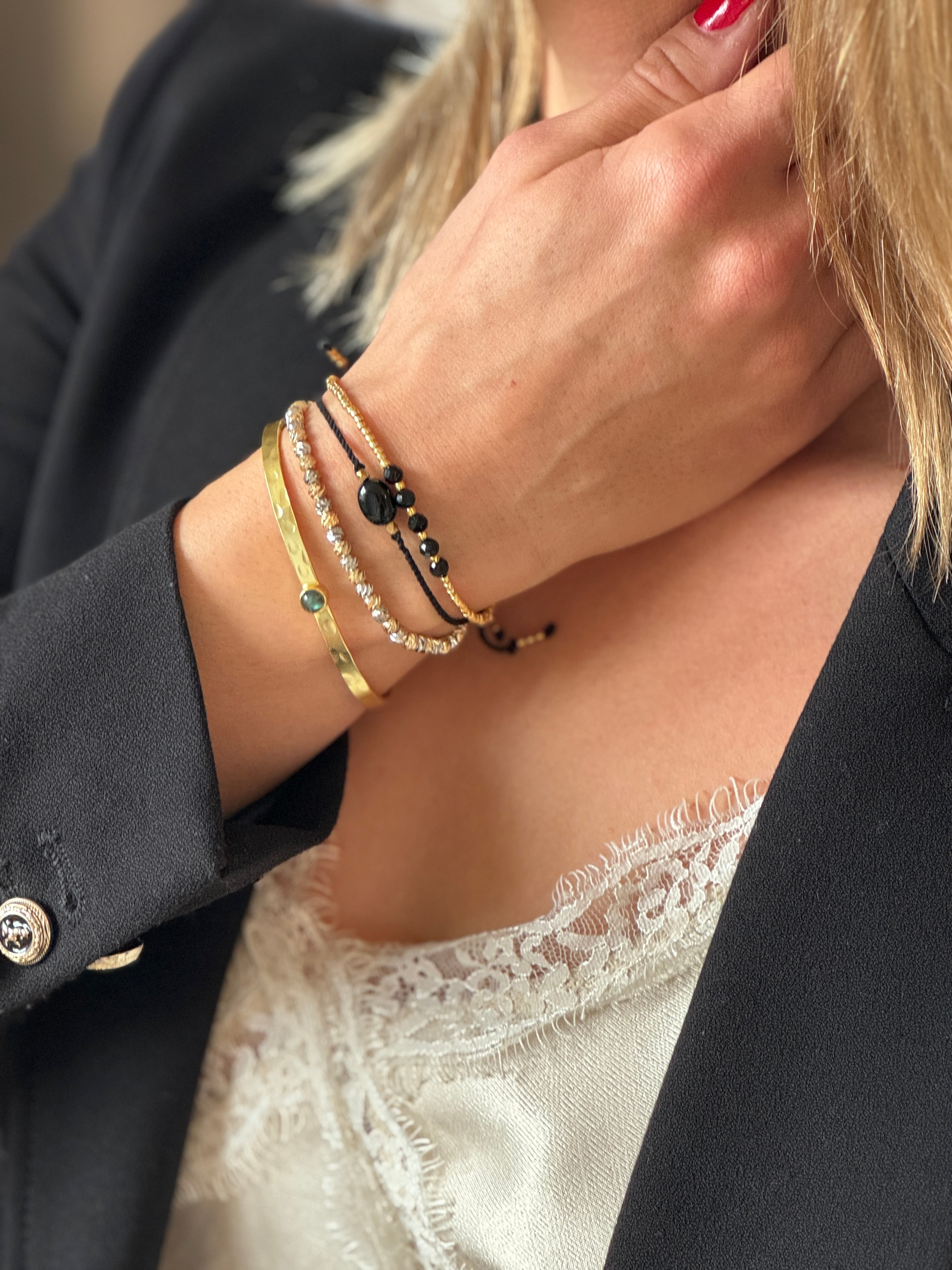Dieses zarte Armband ist hergestellt aus Baumwollgarn, goldfarbenen Glasperlen und mittig platzierten Onyx Edelsteinen. Das Armband ist verstellbar durch einen Schiebeknoten, so dass das Armband nach Deinem Geschmack eingestellt werden kann und schön an Deinem Handgelenk liegt.