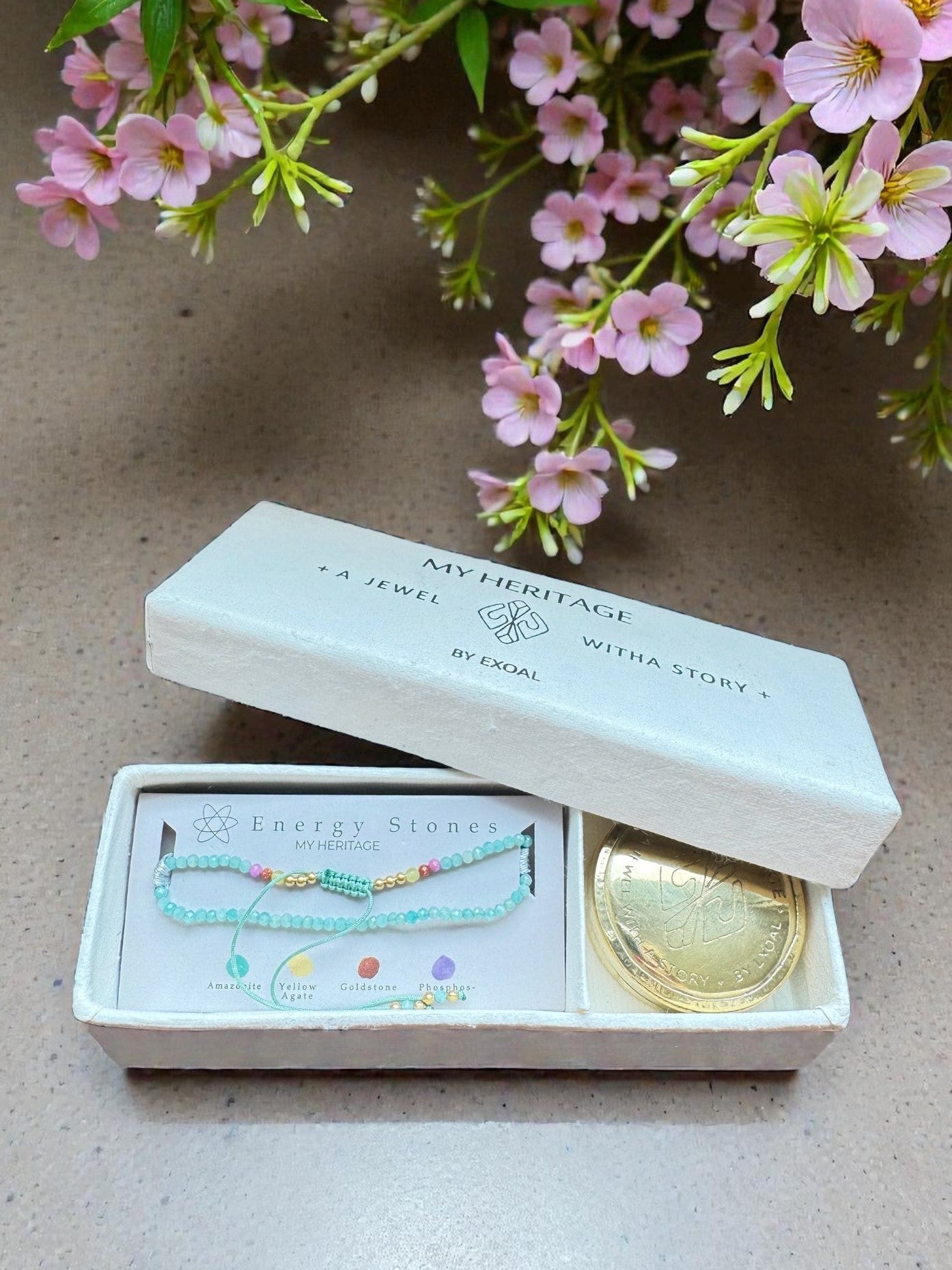 Die "My Heritage"-Armbänder kommen alle in der abgebildeten Verpackung. Die Verpackung enthält neben dem Armband auch eine Messingdose, um das Armband aufzubewahren und ein kleines Handbuch, in dem die Kräfte der Steine erläutert werden.