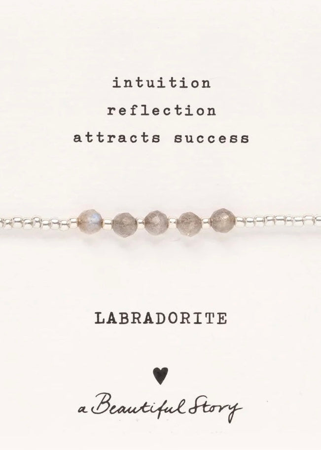 Material: Labradorite Steine, silberfarbige Glasperlen, Baumwollgarn