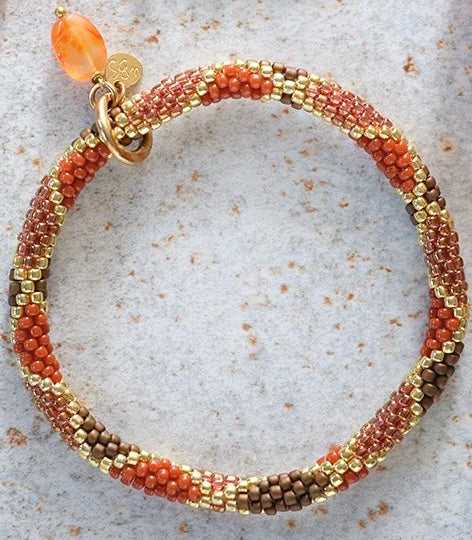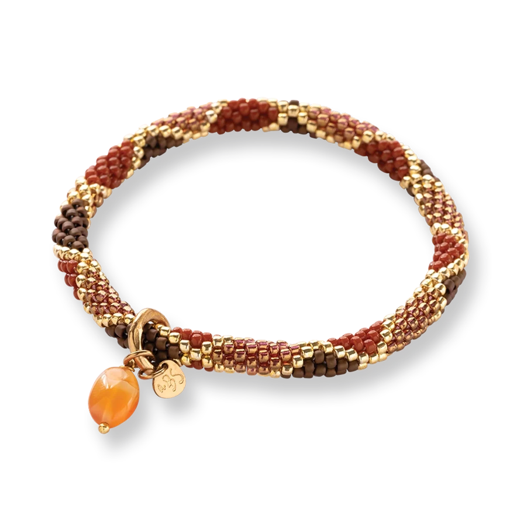 Entdecke das goldfarbige Karneol Armband. Dieses Roll-On-Armband aus farbigen Glasperlen hat einen Karneol-Edelstein-Anhänger. Perfekt für jedes Handgelenk und ideal zum Kombinieren mit anderem Schmuck.