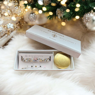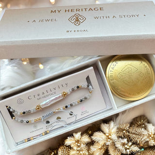 Diese wunderschönen Armbänder kommen in der abgebildeten Geschenkverpackung mit einer Messingdose, um das Armband aufzubewahren, und einem kleinen Handbuch, in dem die Kräfte der Steine erläutert werden. My Heritage Kollektion