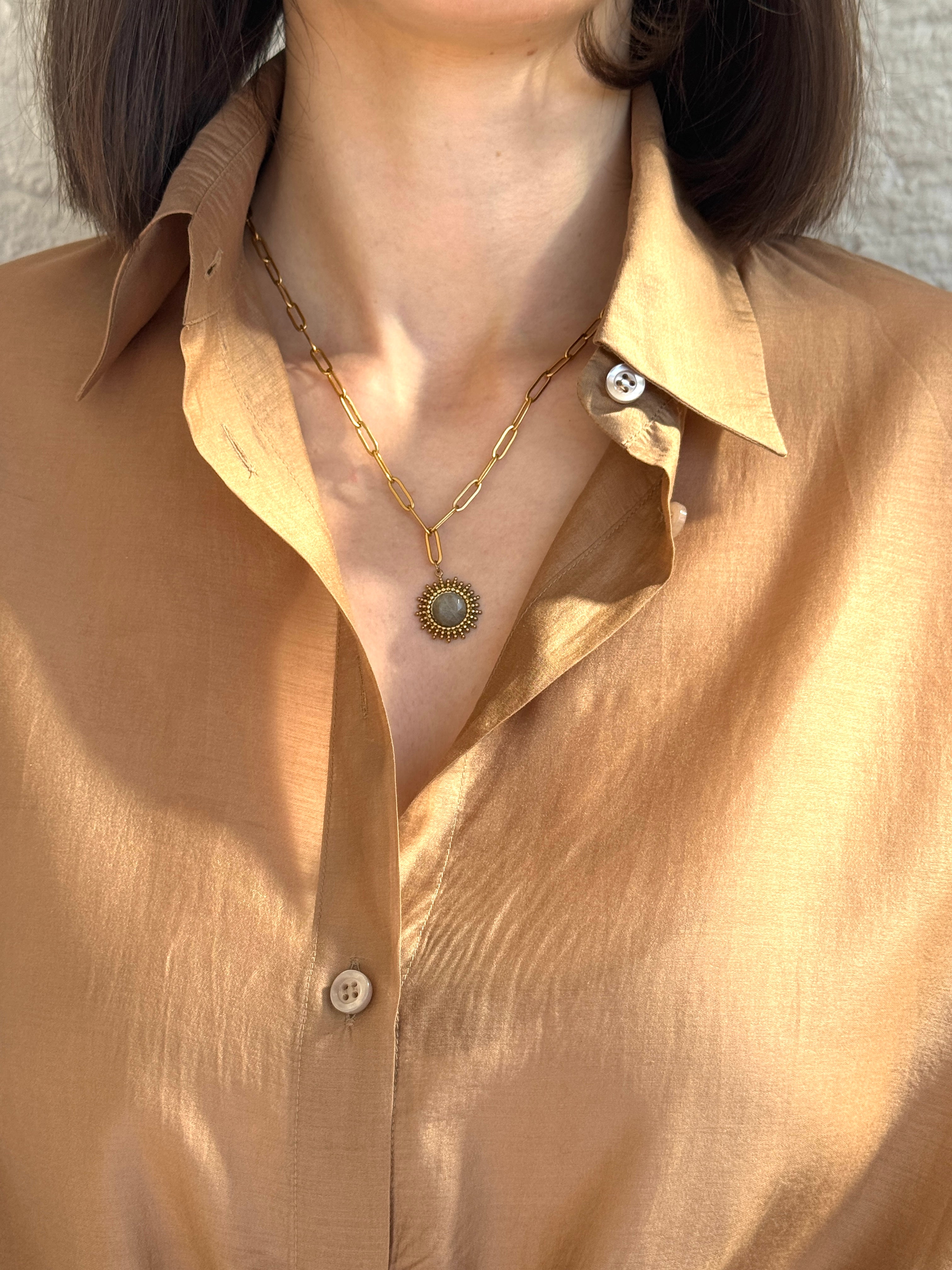 Diese Paperclip Kette aus 18K vergoldetem Edelstahl und Labradorit Sonnen-Anhänger wird mit Liebe von Hand in Deutschland erstellt.