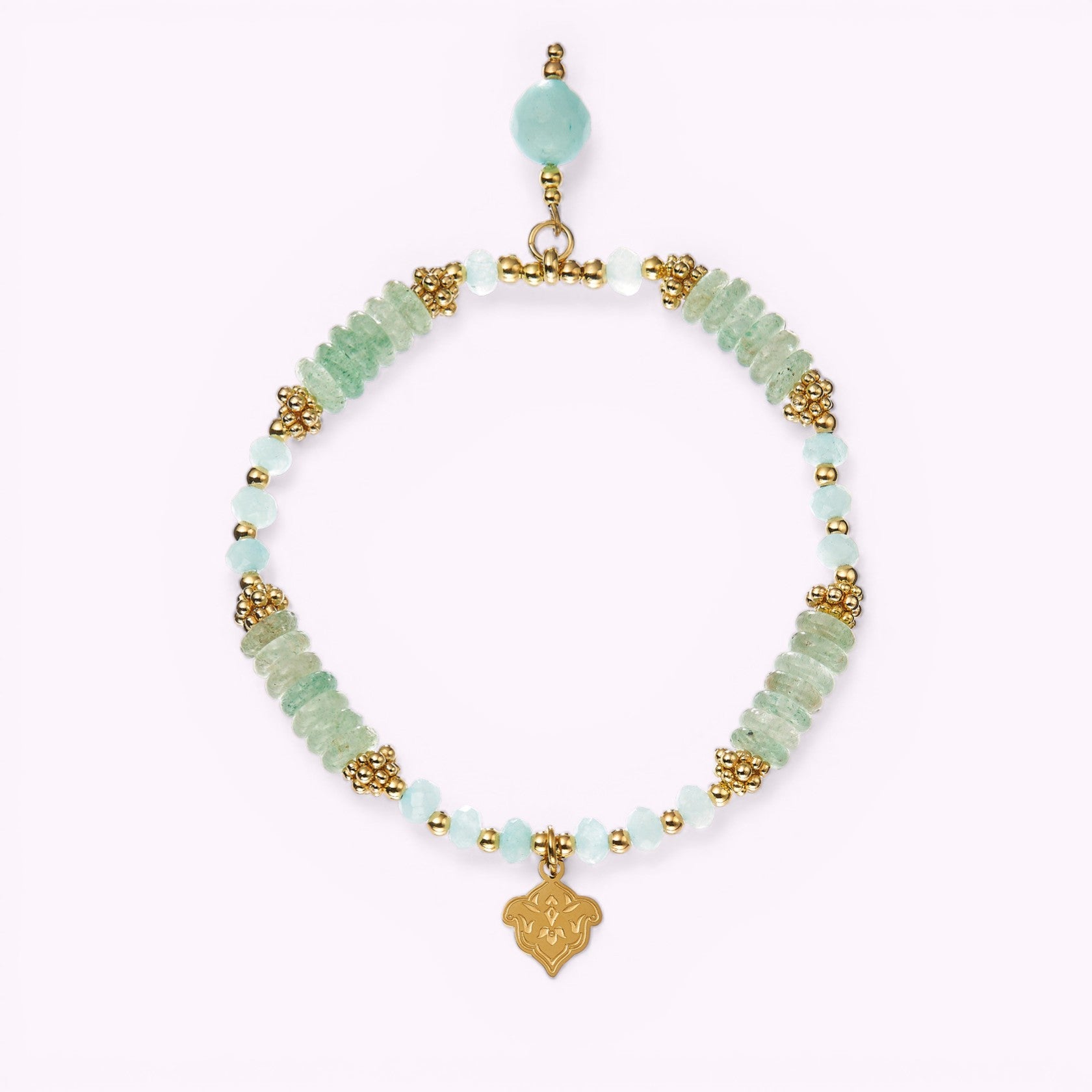 Mala Armband mit Perlen aus vergoldetem 925er Sterlingsilber, Aventurin, facettierter Jade (hellblau) und Anhänger