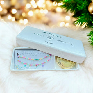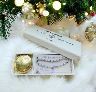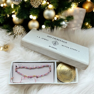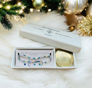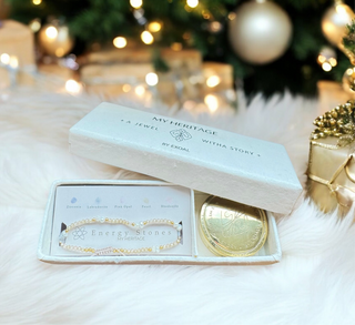 Die "My Heritage" Armbänder kommen in der abgebildeten Geschenkverpackung mit einer Messingdose, um das Armband aufzubewahren und einem kleinen Handbuch, in dem die Kräfte der Steine erläutert werden.