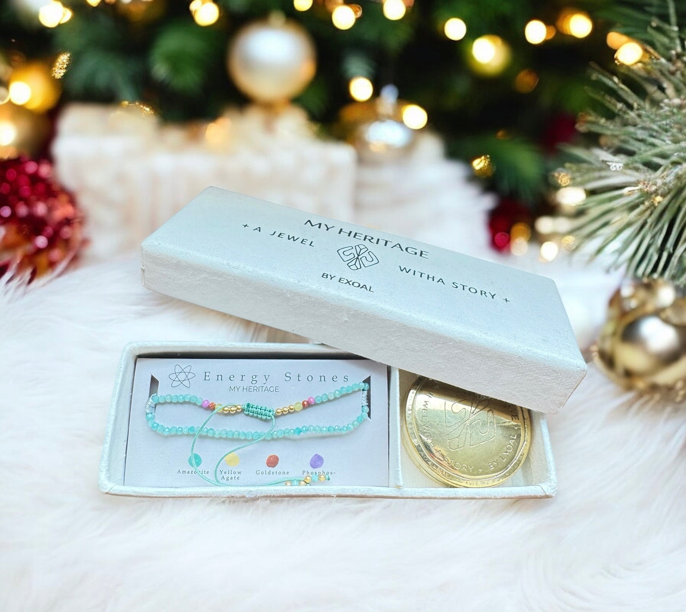 Die "My Heritage"-Armbänder kommen alle in der abgebildeten Verpackung. Die Verpackung enthält neben dem Armband auch eine Messingdose, um das Armband aufzubewahren und ein kleines Handbuch, in dem die Kräfte der Steine erläutert werden.