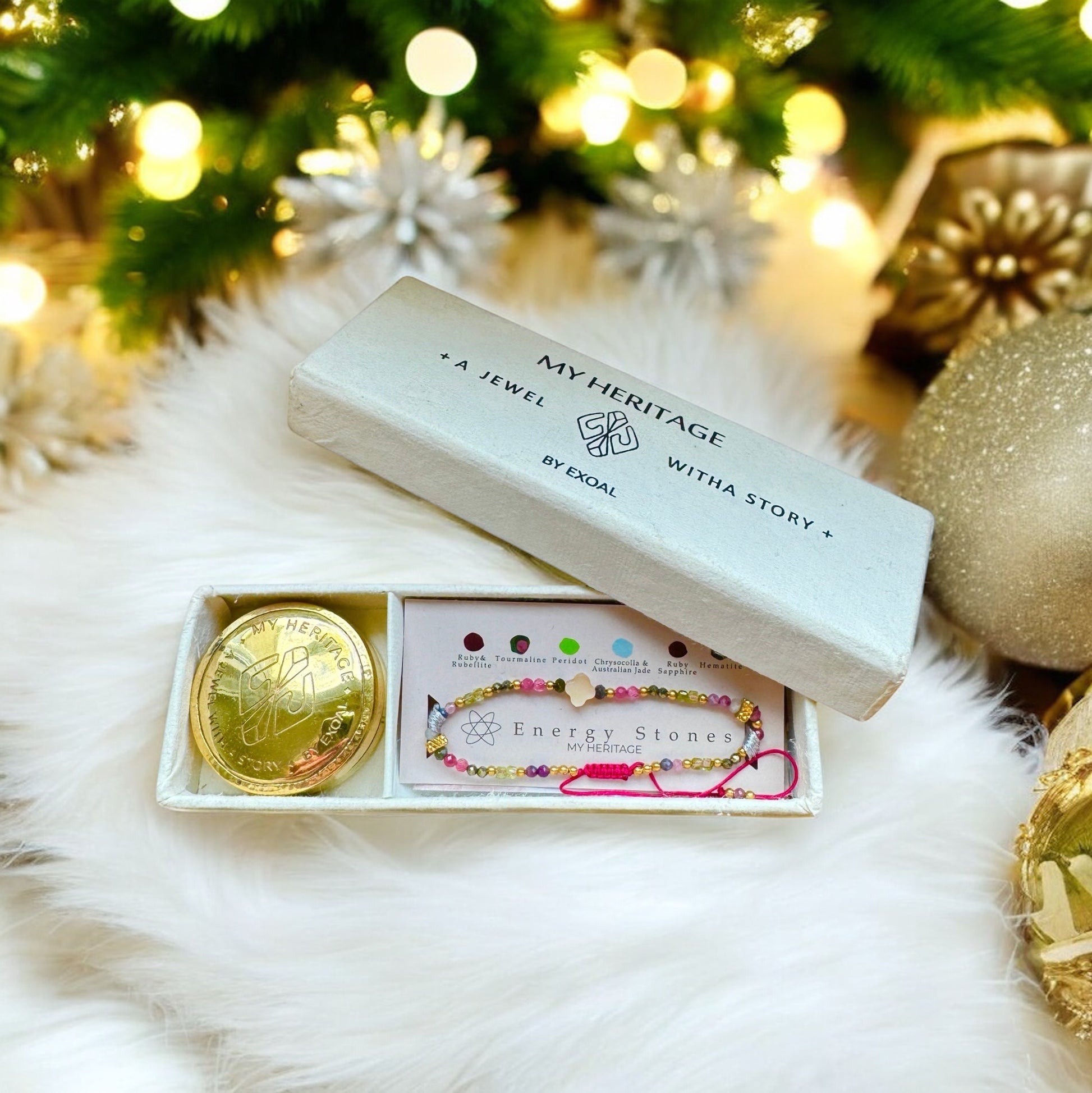 Die "My Heritage"-Armbänder kommen alle in der abgebildeten Verpackung. Die Verpackung enthält neben dem Armband auch eine Messingdose, um das Armband aufzubewahren und ein kleines Handbuch, in dem die Kräfte der Steine erläutert werden.