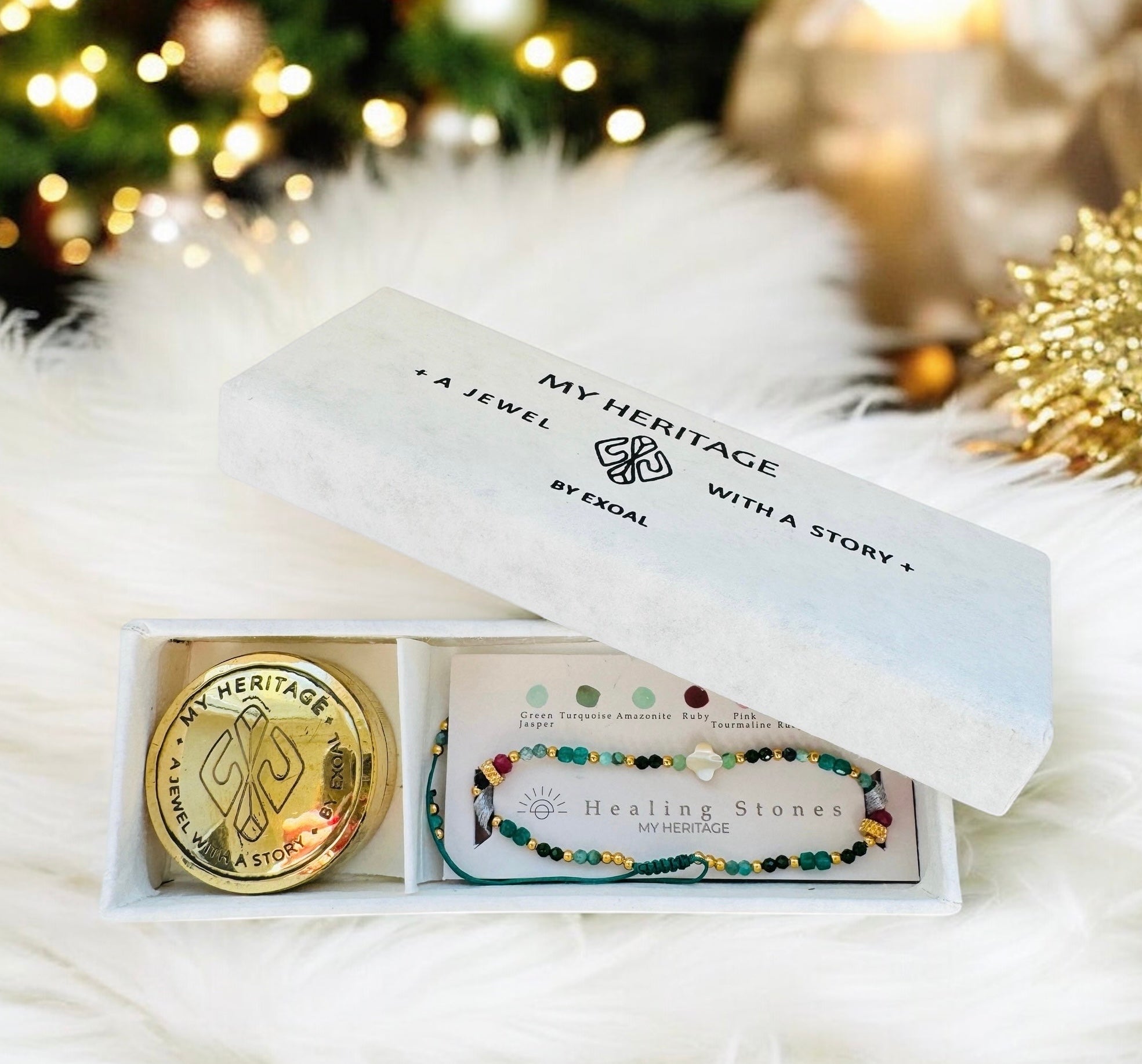 Die "My Heritage"-Armbänder kommen alle in der abgebildeten Verpackung. Die Verpackung enthält neben dem Armband auch eine Messingdose, um das Armband aufzubewahren und ein kleines Handbuch, in dem die Kräfte der Steine erläutert werden.