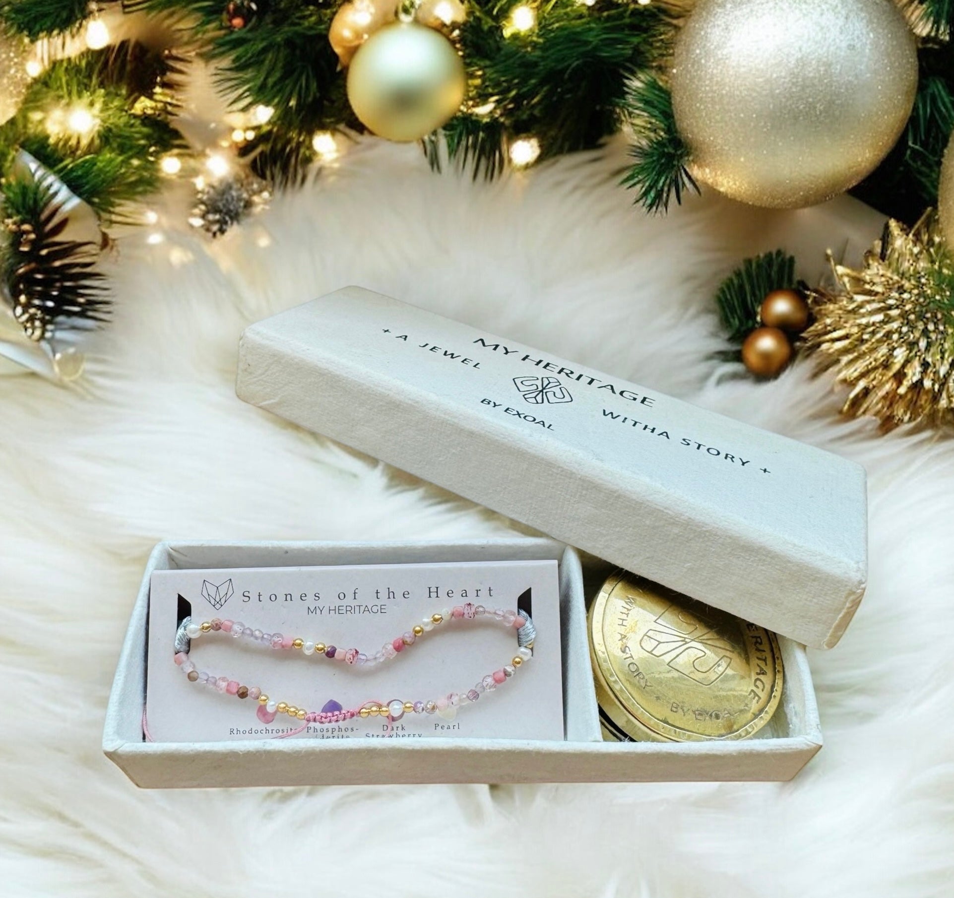 Die "My Heritage"-Armbänder kommen alle in der abgebildeten Verpackung. Die Verpackung enthält neben dem Armband auch eine Messingdose, um das Armband aufzubewahren und ein kleines Handbuch, in dem die Kräfte der Steine erläutert werden.