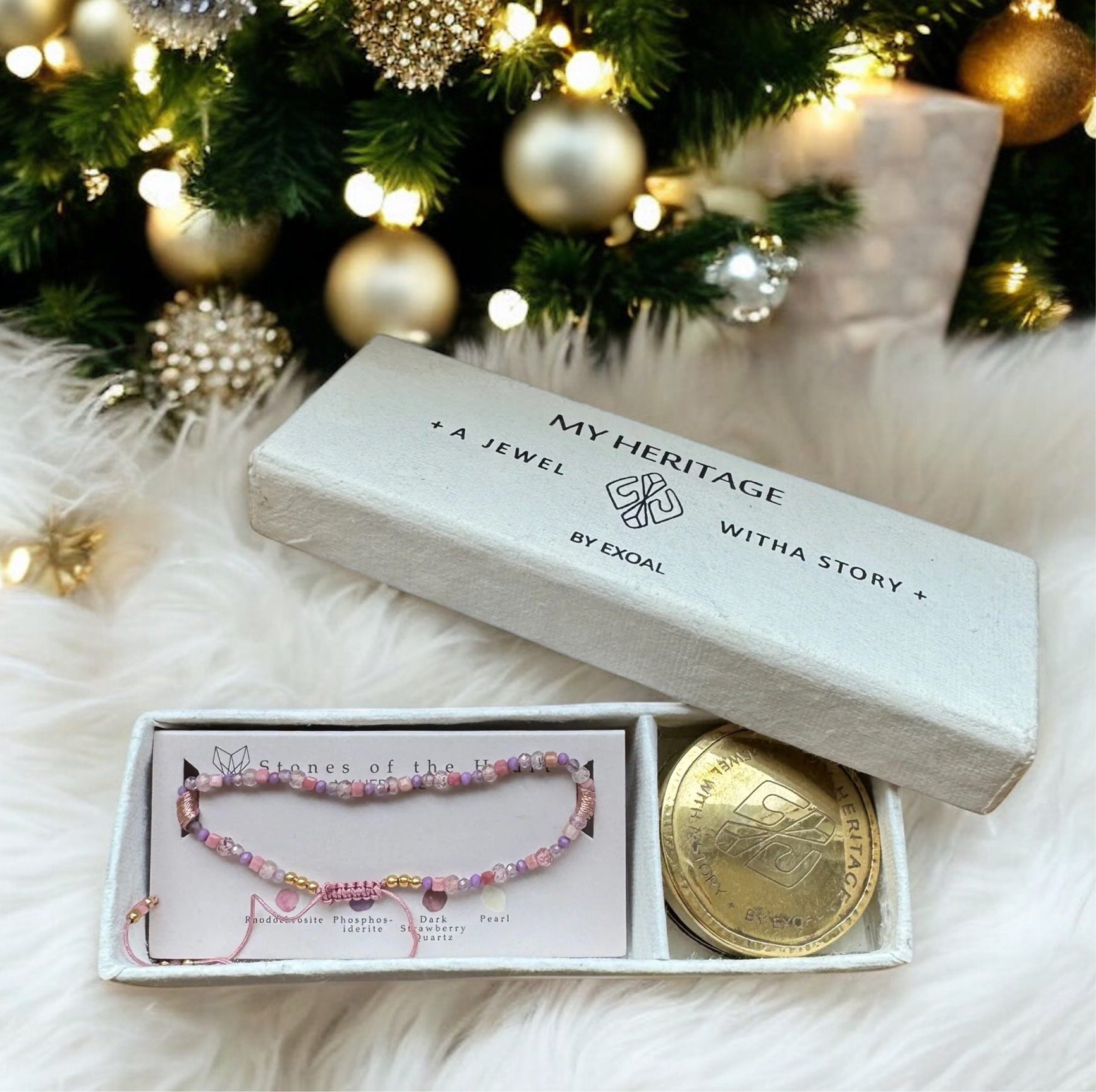 Die "My Heritage"-Armbänder kommen alle in der abgebildeten Verpackung. Die Verpackung enthält neben dem Armband auch eine Messingdose, um das Armband aufzubewahren und ein kleines Handbuch, in dem die Kräfte der Steine erläutert werden.