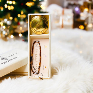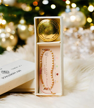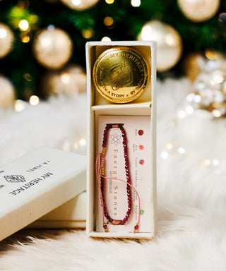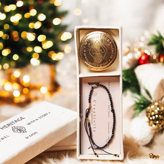 Die "My Heritage" Armbänder kommen in der abgebildeten Geschenkverpackung mit einer Messingdose, um das Armband aufzubewahren und einem kleinen Handbuch, in dem die Kräfte der Steine erläutert werden.