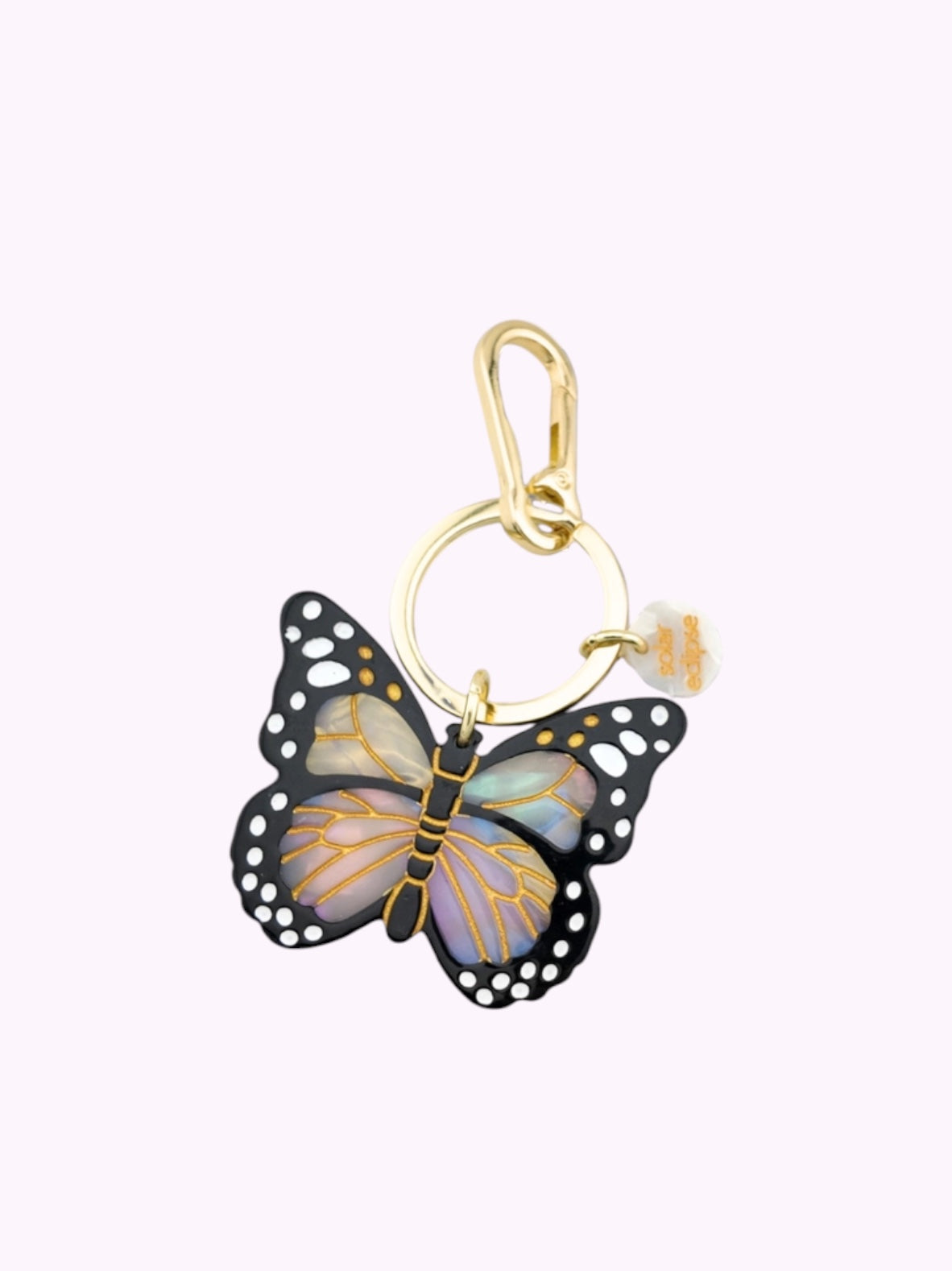 Der Schmetterling Taschen/Schlüsselanhänger wird von den Solar Eclipse -Künstlern handgefertigt. Sorgfältig hergestellt aus Celluloseacetat — einem umweltfreundlichen, biologisch abbaubaren Material aus recyceltem Holzzellstoff.