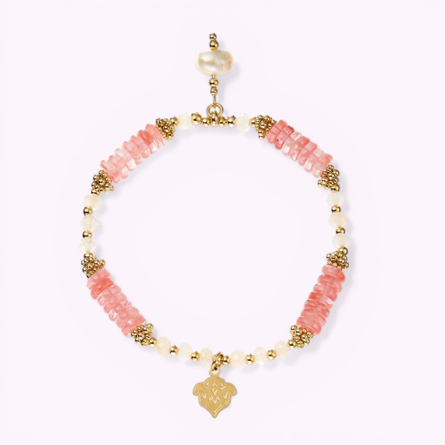 Mala Armband mit Perlen aus vergoldetem 925er Sterlingsilber, Erdbeerquarz, facettiertem Jade (creme) und Anhänger