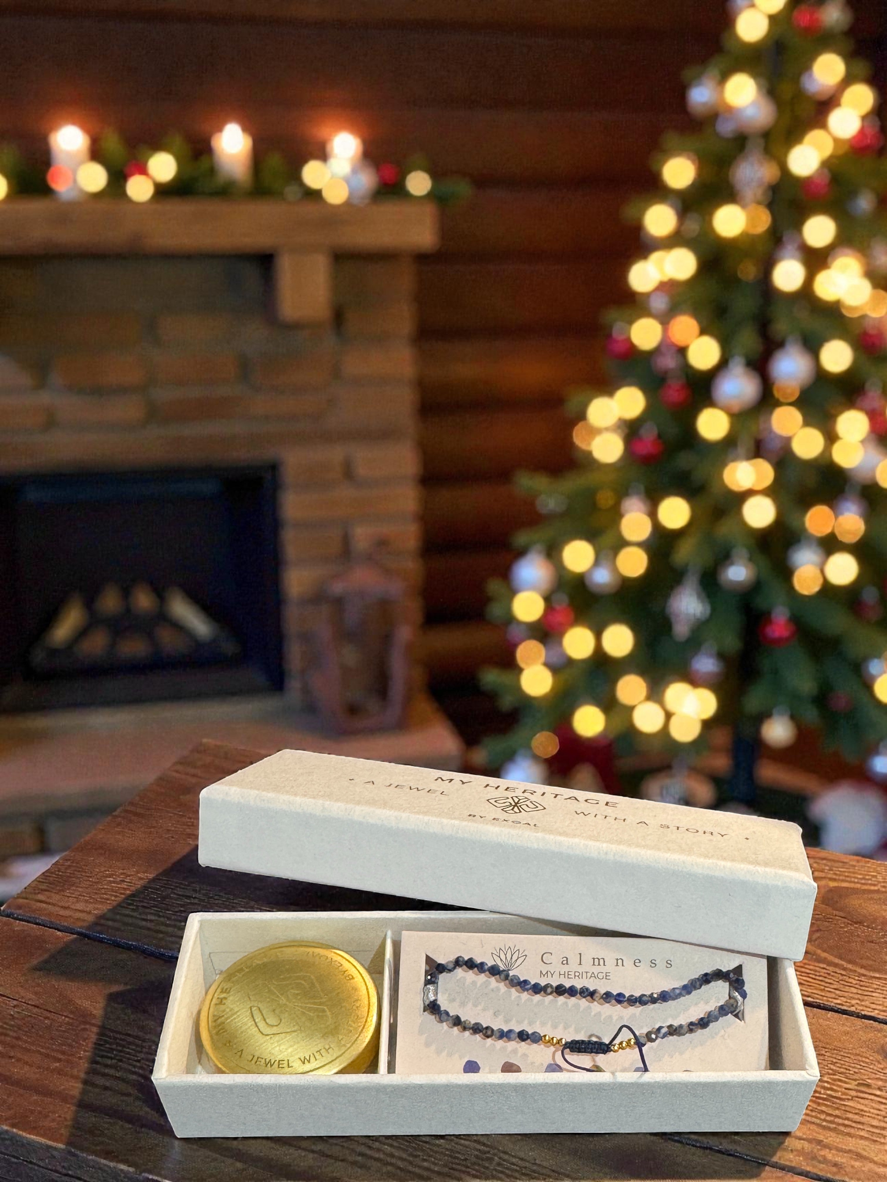 Die "My Heritage"-Armbänder kommen alle in der abgebildeten Verpackung. Die Verpackung enthält neben dem Armband auch eine Messingdose, um das Armband aufzubewahren und ein kleines Handbuch, in dem die Kräfte der Steine erläutert werden.