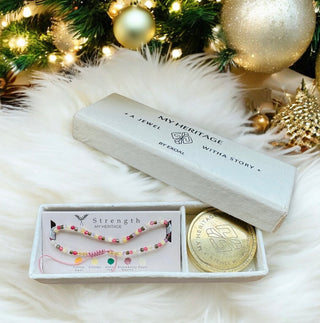 Diese wunderschönen Armbänder kommen in der abgebildeten Geschenkverpackung mit einer Messingdose, um das Armband aufzubewahren, und einem kleinen Handbuch, in dem die Kräfte der Steine erläutert werden. My Heritage Kollektion