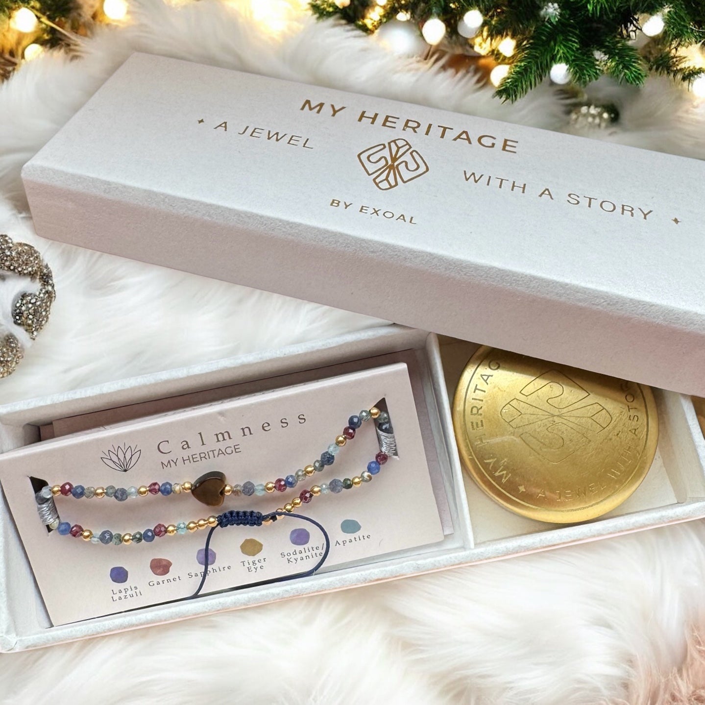 Die "My Heritage"-Armbänder kommen alle in der abgebildeten Verpackung. Die Verpackung enthält neben dem Armband auch eine Messingdose, um das Armband aufzubewahren und ein kleines Handbuch, in dem die Kräfte der Steine erläutert werden.