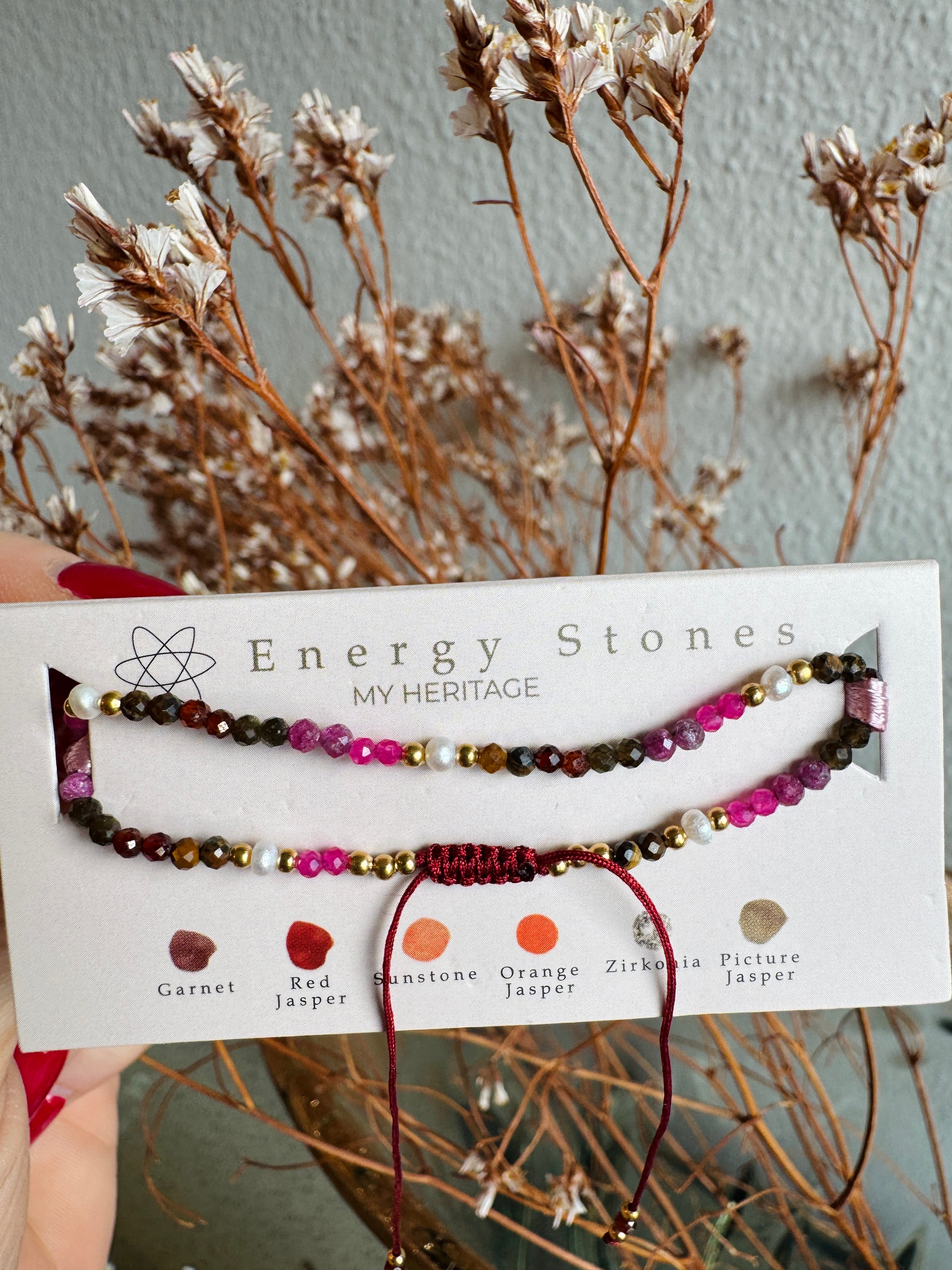 Dieses wunderschöne pink-rote Armband ist aus handselektierten pinken Jade Steinen, roten Garnet Halbedelsteinen, braunen Jasper Steinen und Süsswasser Perlen gefertigt.