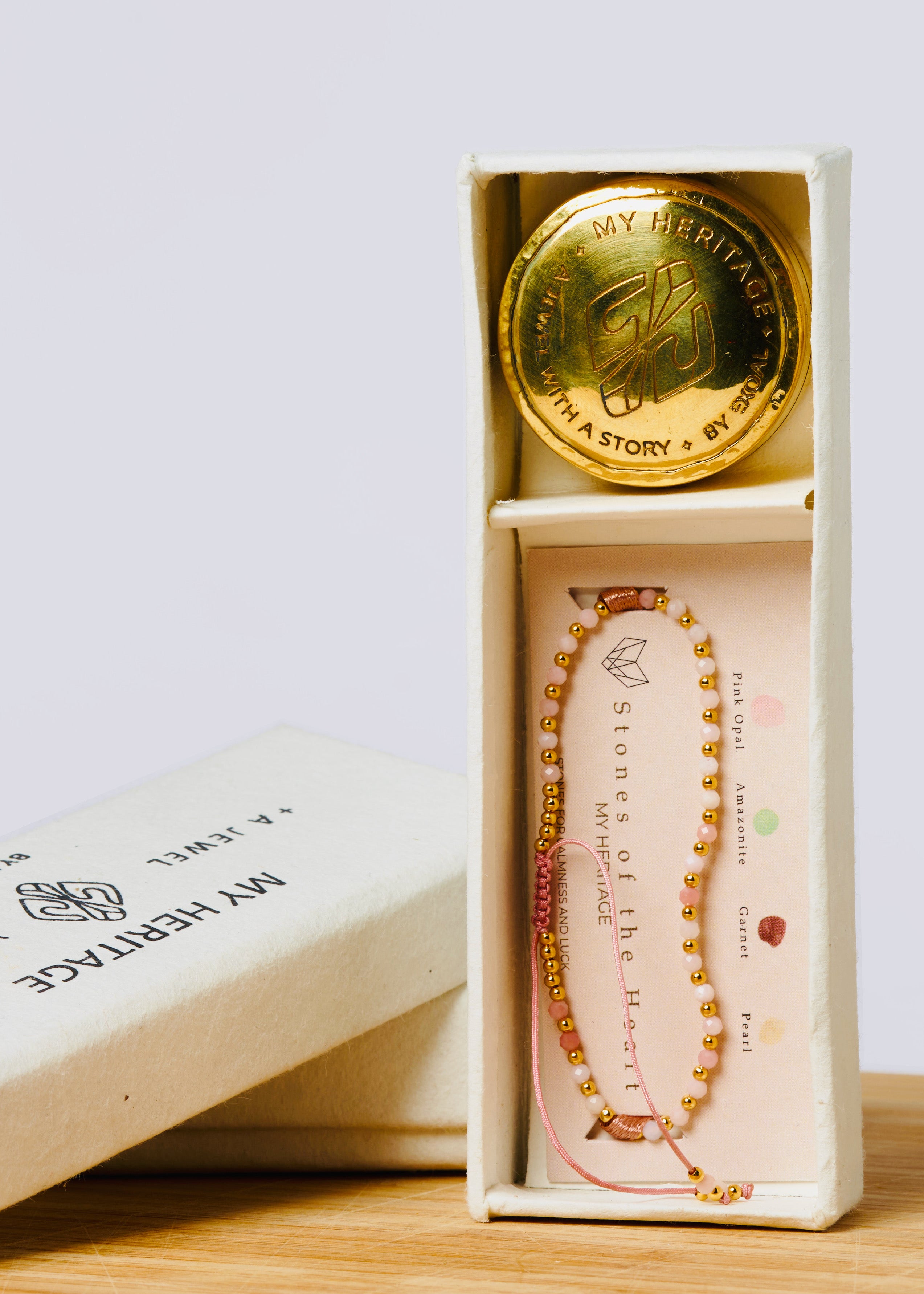 Die "My Heritage"-Armbänder kommen alle in der abgebildeten Verpackung. Die Verpackung enthält neben dem Armband auch eine Messingdose, um das Armband aufzubewahren und ein kleines Handbuch, in dem die Kräfte der Steine erläutert werden.