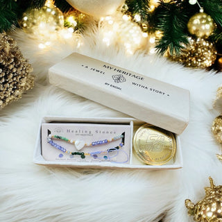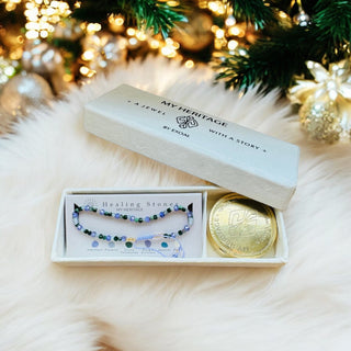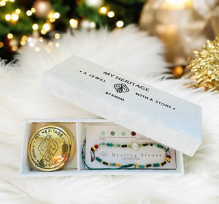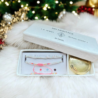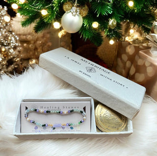 Diese wunderschönen Armbänder kommen in der abgebildeten Geschenkverpackung mit einer Messingdose, um das Armband aufzubewahren, und einem kleinen Handbuch, in dem die Kräfte der Steine erläutert werden. My Heritage Kollektion