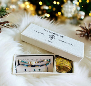 Diese wunderschönen Armbänder kommen in der abgebildeten Geschenkverpackung mit einer Messingdose, um das Armband aufzubewahren, und einem kleinen Handbuch, in dem die Kräfte der Steine erläutert werden. My Heritage Kollektion
